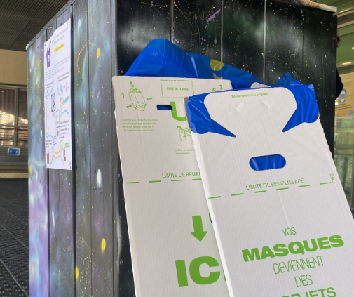 Avec le Service Public et Citoyenneté de Grenoble basé à la Villeneuve, nous avons construit un bac avec du bois réutilisé d'un ancien chantier ouvert au public. Ce bac a servi à protéger les cartons que les entreprises de recyclage proposent (dans lesquels sont vraiment les masques). Le mercredi 15 mars 2023, notre bac a été officiellement installé sous le parvis de l'hôpital couples-enfants. Il y est resté 2 mois, le temps de récolter 1800 masques grâce aux 6 cartons que nous avions pu acheter avec le budget que nous avions.